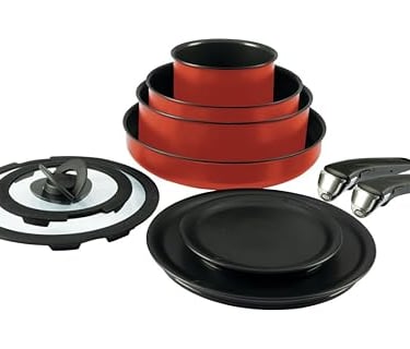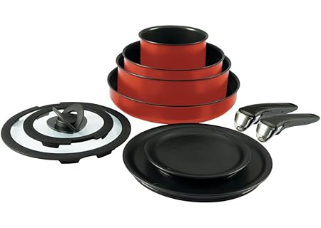 T-fal Ingenio Expertise Non Stick Cookware Set 10 Piece, Induction, Oven Broiler Safe 500F, Stackable Cookware, Pots and Pans, RV, Camping, Kitchen Frying Pans, Dishwasher Safe, Detachable Handle, Red